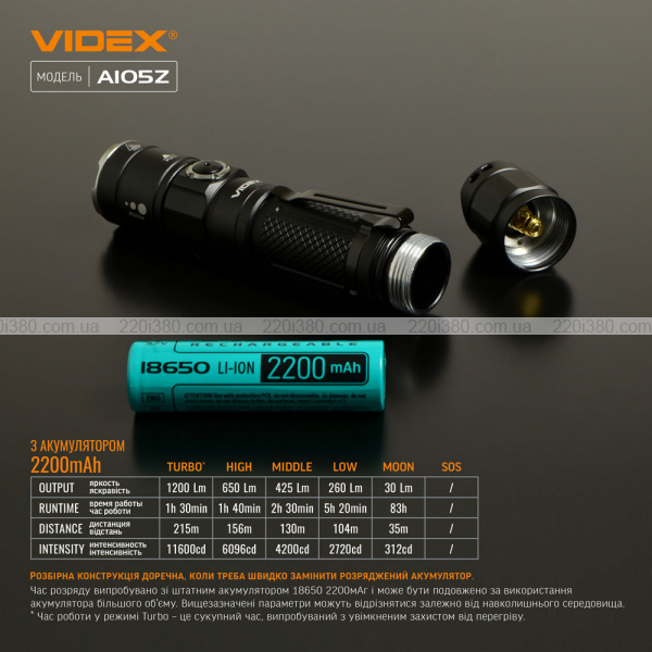 | Режим роботи: | Турбо, максимум, средний, низкий, ночной, SOS |
