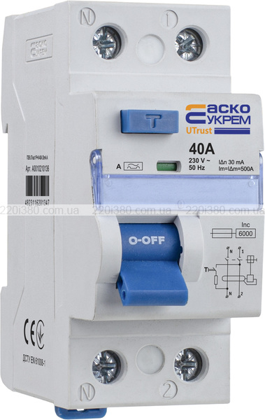 Пристрій захисного відключення UTrust 1P+N 40А 30mА А