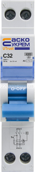 Пристрій захисного відключення з захистом від надструмів UTrust 1P+N (18 mm) 32А C 30mА AC