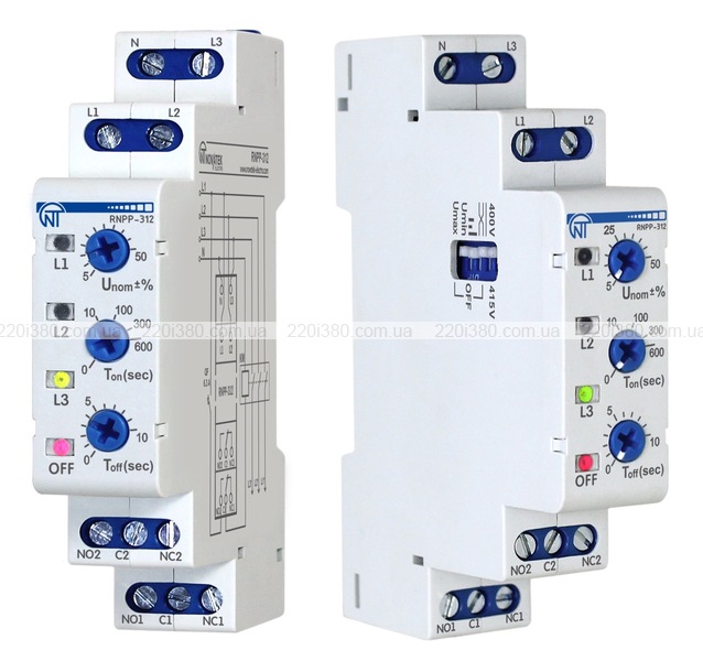 RNPP-312 призначене: для контролю допустимого рівня напруги.для контролю правильного чергування і відсутності злипання фаз.для контролю повнофазності і симетричності напруги мережі (перекосу фаз).для вимкнення навантаження при неякісній напрузі мережі.для контролю напруги мережі після вимкнення навантаження і автоматичного увімкнення її після відновлення параметрів напруги.для відображення аварії при виникненні аварійної ситуації і відображення наявності напруги на кожній фазі.У виробі передбачені можливості регулювання параметрів (порогу спрацьовування за напругою, часу АПВ і часу затримки спрацьовування захисту), вибору напруги мережі, що контролюється (400 В або 415 В) і набору захисних функцій.Після відновлення параметрів напруги мережі виріб знову вмикає навантаження через час АПВ.RNPP-312 працює в різних режимах:Контроль мінімальної / максимальної напруги.Контроль мінімальної напруги.Контроль максимальної напруги.Контроль наявності фаз.Контроль неправильного чергування і наявності злипання фаз.Контроль перекосу фаз. Контроль наявності фаз зберігається в будь-якому режимі роботи. В усіх режимах роботи виріб спрацьовує при обриві фаз або зниженні напруги нижче 100 B на одній або декількох фазах за фіксований час 0,2 сВиріб на виході має дві групи незалежних вихідних перекидних контактів (NO1-C1-NC1, NO2-C2-NC2).В «ХОЛОДНОМУ СТАНІ» (виріб без напруги, не підключений) контакти C1-NC1 (C2-NC2) замкнені, а контакти NO1-C1 (NO2-C2) розімкнені. Коли реле навантаження спрацьовує, вимкнення навантаження відбувається шляхом розриву ланцюга живлення котушки МП через контакти NO1-C1 (NO2-C2), за виключенням режиму «Контроль максимальної напруги», в якому виріб працює із зворотною логікою увімкнення.Переваги:Підключення через пускач.Можливість відключення захисних функцій.Перекидний контакт.Дуже компактний розмір.Перешкодозахищеність завдяки імпульсному блоку живлення.Декілька режимів роботи.Сфера застосування:Для контролю фазових та лінійних напруг в трифазній мережі.Для захисту трифазного або, в деяких випадках, однофазного обладнання від аварій в трифазній мережі, як-то: аварія за напругою, неправильне чергування та злипання фаз, неповнофазність та несиметричність напруги.Ідеально підходить для захисту холодильних та вентиляційних установок, шафів АВР.В компактних шафах керування, де є необхідність економити місце.Основні можливості:Контроль дозволеного рівня діючого значення напруги.Контроль правильного чергування фаз та відсутності їх злипання.Контроль повнофазності та симетричності мережевої напруги.Вимикання навантаження шляхом розмикання ланцюга живлення котушки магнітного пускача у разі виникнення умов для спрацьовування.Контроль якості напруги мережі після відключення навантаження та його автоматичне увімкнення після відновлення параметрів напруги.Можливість відключення захисних функцій.* якщо аварія виникла за мінімальною напругою, фіксований час спрацьовування виробу становить 12 с, за умови, що перемикачі Umax і Umin знаходяться в положенні “Увімкнено”. За будь-якої іншої комбінації перемикачів Umax і Umin, виріб спрацьовує через час затримки, заданого Користувачем ручкою Тoff(sec). Якщо протягом цього часу відбудеться зміна параметрів мережі, наприклад, за максимальною напругою, виріб спрацює за найменшим з періодів – через 