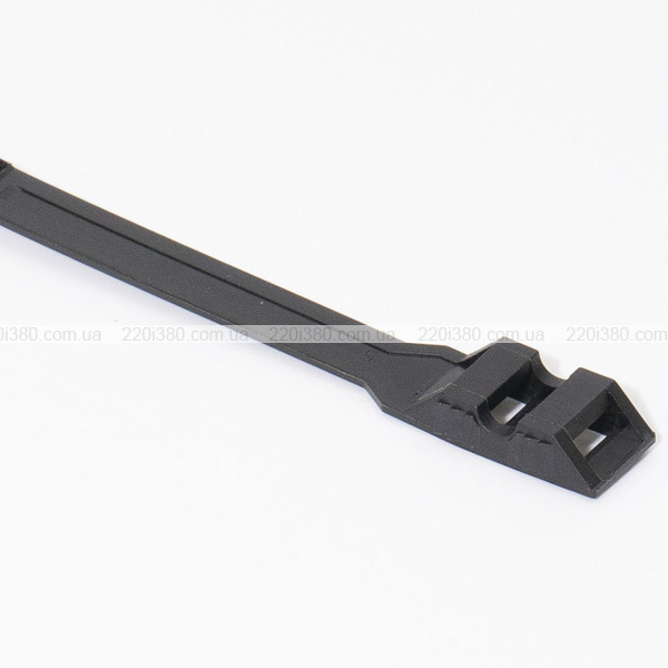 Особливості конструкції:Головка хомута має посилену низькопрофільну конструкцію, витримує великі навантаження та спрямовує полотно хомута у паралельній площині.Цей тип хомутів оснащений головкою з поздовжньою фіксацією полотна. Це означає, що хвостова частина хомута вставляється в головку, протягується через неї і фіксується паралельно (повздовжньо) по відношенню до всього полотна хомута, а не під прямим кутом, як це відбувається в хомутах зі стандартною фіксуючою головкою.Така конструкція дає кабельним стяжкам деякі переваги, а саме:Головне - це мінімізація ймовірності заподіяння будь-яких травм та пошкоджень людям, які працюють і знаходяться поряд з уже встановленими хомутами, а також сусіднім проводам та іншому обладнанню, завдяки тому, що фіксуюча головка має низький округлений профіль, і з неї не виступає під прямим кутом хвостова частина хомута. Залишок хвостової частини хомута, що виступає з голівки після монтажу, рекомендується обрізати "під нуль". Але навіть якщо цього не зробити, то хвостовик розташовується паралельно з полотном хомута, і можливість зачепитися за нього набагато нижче, ніж у випадку зі стандартною конструкцією фіксуючої головки. Фіксуючий елемент замку стає недоступним після застібання та обрізання стрічки хомуту, що дозволяє уникнути несанкціонованого доступу або випадкового розстібування, при попаданні в голівку будь-яких сторонніх предметів.