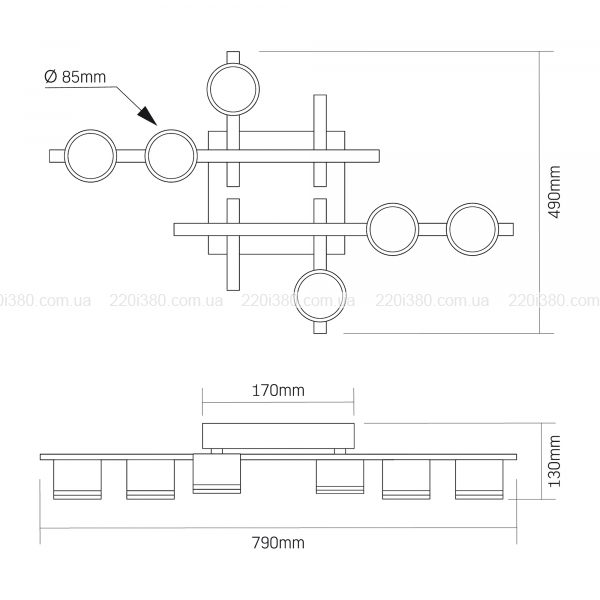 В якості джерела світла в даній моделі використовуються 6 лампочок з цоколем GX53 і максимальною потужністю до 30W кожна. Габаритні розміри складають: основа - 170х170x45мм, планки довжиною 278мм (2шт) та 523мм (2шт), а голова світильника має діаметр 85мм і висоту 65мм кожна (6шт). Загальна довжина світильника складає 790мм, ширина 490мм, а висота 130мм.