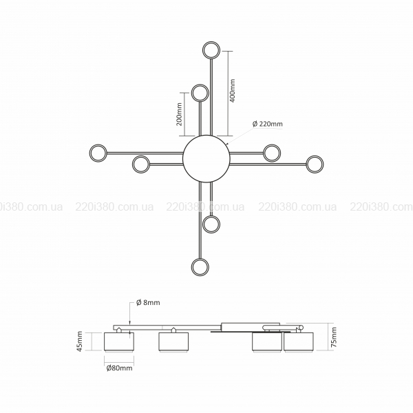Як джерело світла використовується 8 лампочок з цоколем GX53 і максимальною потужністю до 30W кожна. Довговічний, має високий ступінь захисту від негативного впливу зовнішнього середовища. Буде служити довго, що підтверджується гарантією - 2 роки. При виготовленні використовуються тільки безпечні матеріали. Лампа в комплект до світильника не входить!
