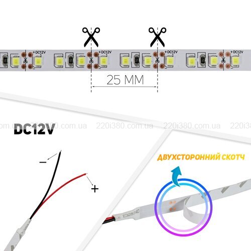Енергоспоживання стрічки становить 14 Вт/м, кількість діодів у одному метрі – 120 шт. Колірна температура виробу – 6000-6500К, кути світіння – 120°. Термін служби стрічки оцінюється у 20 000 годин, а виробник дає гарантію на виріб 12 місяців.