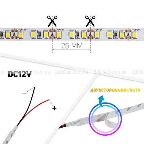Енергоспоживання стрічки становить 9 Вт/м, кількість діодів у одному метрі – 120 шт. Колірна температура виробу – 2800-3200К, кути світіння – 120°. Термін служби стрічки оцінюється у 20 000 годин, а виробник дає гарантію на виріб 12 місяців.