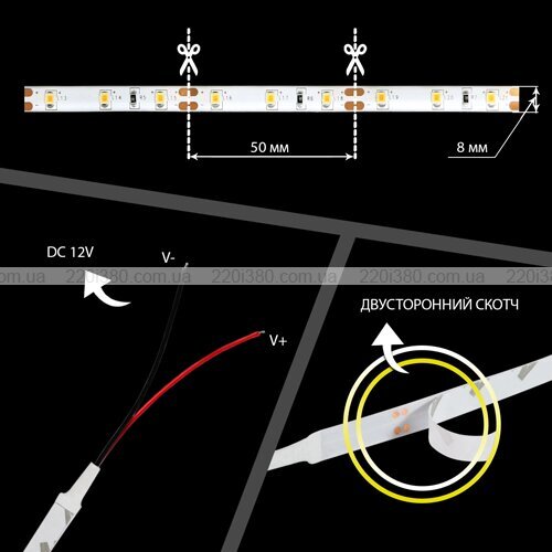 Енергоспоживання стрічки становить 4,8 Вт/м, кількість діодів у одному метрі – 60 шт. Колірна температура виробу – 2800-3200К, кути світіння – 120°. Термін служби стрічки оцінюється у 20 000 годин, а виробник дає гарантію на виріб 12 місяців.
