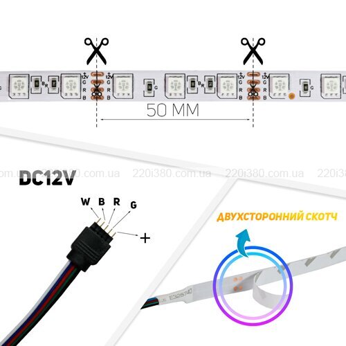 Енергоспоживання стрічки складає 14,4 Вт/м, кількість діодів в одному метрі – 60 шт., Кути світіння – 120°. Термін служби стрічки оцінюється в 20 000 годин, а виробник дає гарантію на виріб 12 місяців.