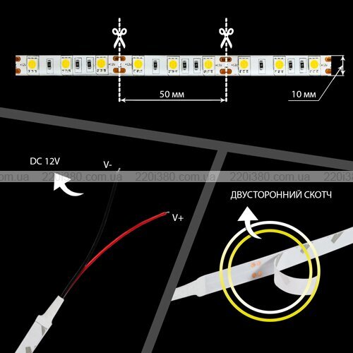 Енергоспоживання стрічки становить 14,4 Вт/м, кількість діодів у одному метрі – 60 шт. Колірна температура виробу – 2800-3200К, кути світіння – 120°. Термін служби стрічки оцінюється у 20 000 годин, а виробник дає гарантію на виріб 12 місяців.