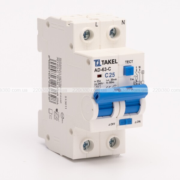 Вимикач автоматичний диференційний AD-63-С 1Р+N 30мА 25А TAKEL