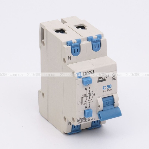 Вимикач автоматичний диференційний ВАД-63-С 2P (1Р+N) 30мА 50А TAKEL