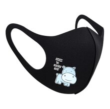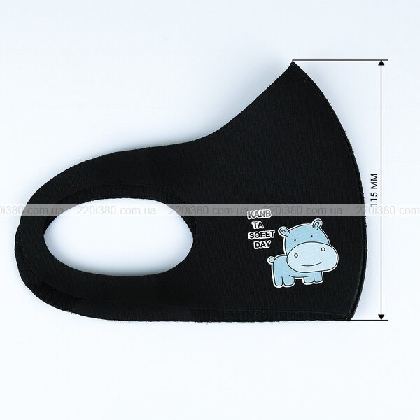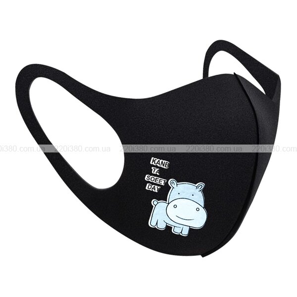 Щільне прилягання до обличчя досягається за рахунок анатомічної форми маски. Колір моделі – чорний, з нашивкою у вигляді фігурки гіпопотама, розмір – підлітковий.