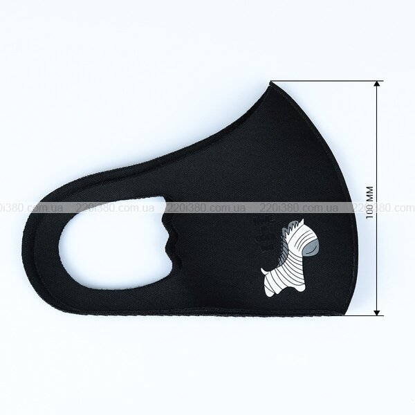 Щільне прилягання до обличчя досягається за рахунок анатомічної форми маски. Колір моделі – чорний, з нашивкою у вигляді фігурки зебри, розмір – дитячий.