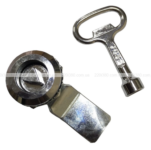 Виконаний із сталі з хромуванням. Замок з ключем металевий, нікельований. Призначений для замикання електричних збірок та шаф, з метою захисту від несанкціонованого проникнення та для захисту збірок від попадання пилу та вологи.