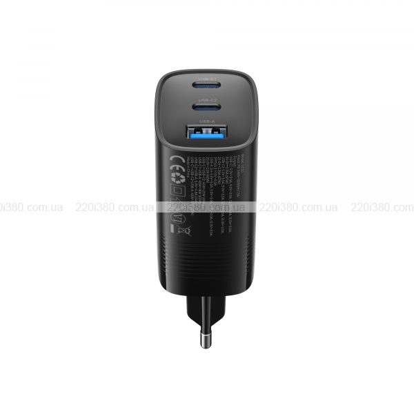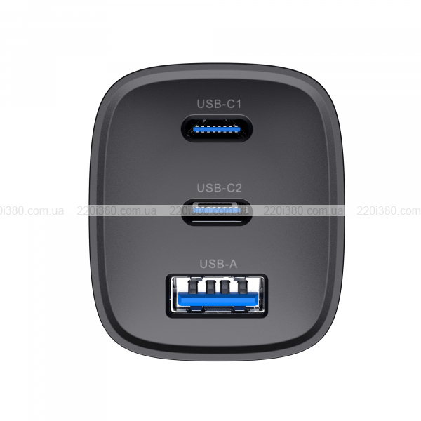 Зарядний пристрій має три виходи: USB-A та 2x USB-C, що дозволяє заряджати одночасно три пристрої.